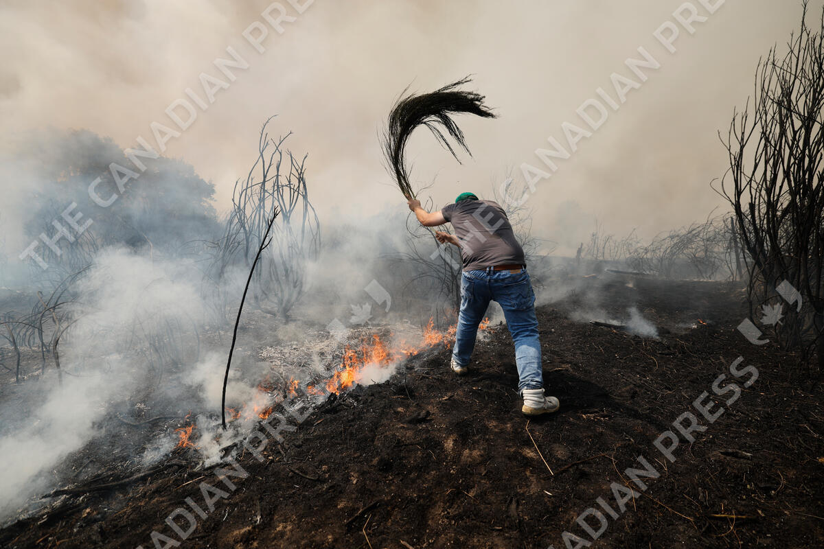 A man battles a wildfire in Veiga das Meas, northwestern Spain, Saturday, Aug. 16, 2025. (AP Photo/Lalo R. Villar)
