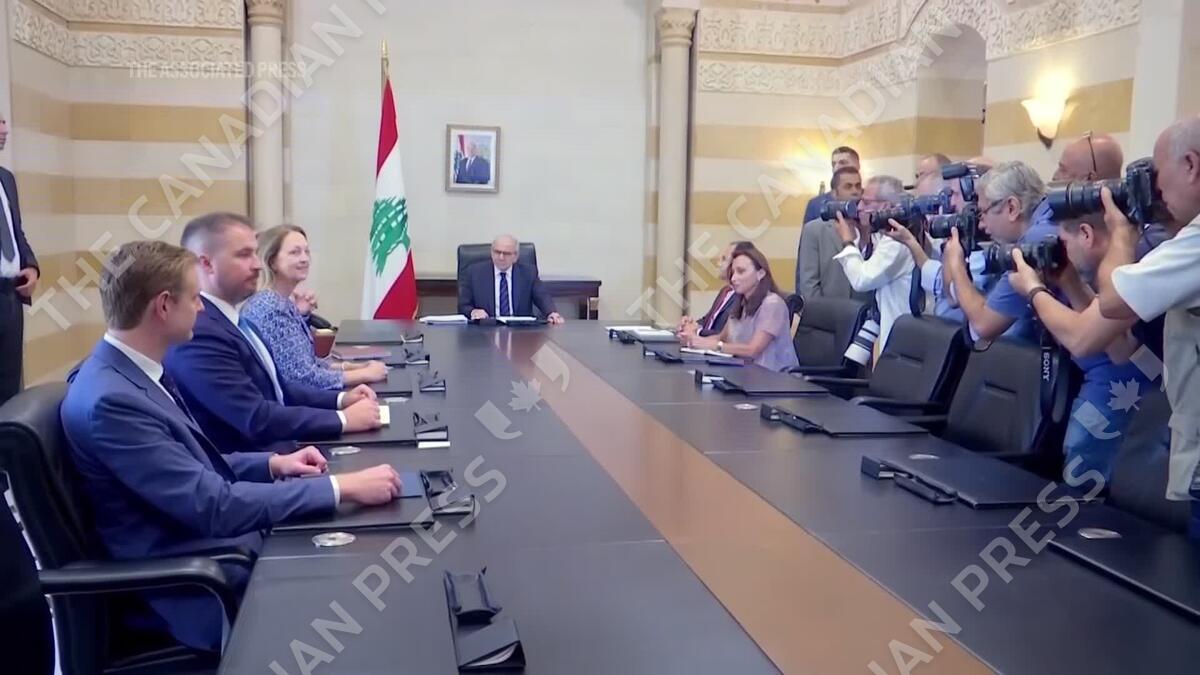 The US special envoy to Lebanon held more meetings with Lebanese leaders in the capital Beirut on Monday. (AP video by Mohammad Anouti and Production by Ali Sharafeddine)