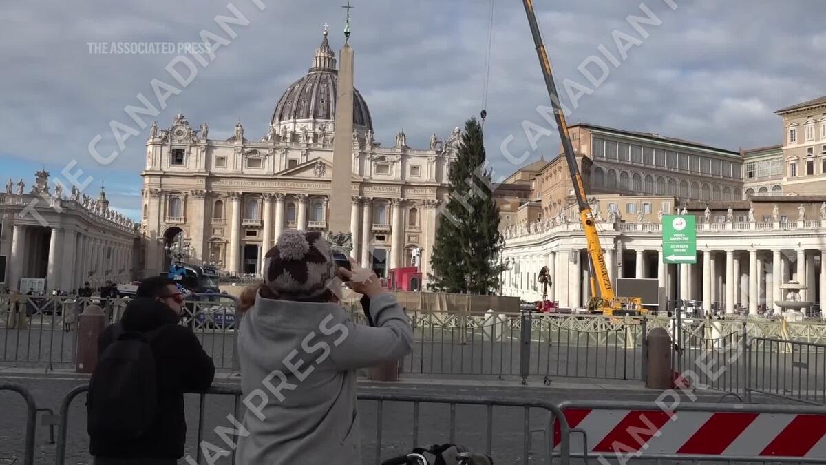 Workers started setting up a 27-meter tall tree at the center of St. Peter's Square on Thursday morning as the Vatican prepares to celebrate this year's Christmas festivities. (AP video shot by: Silvia Stellacci)