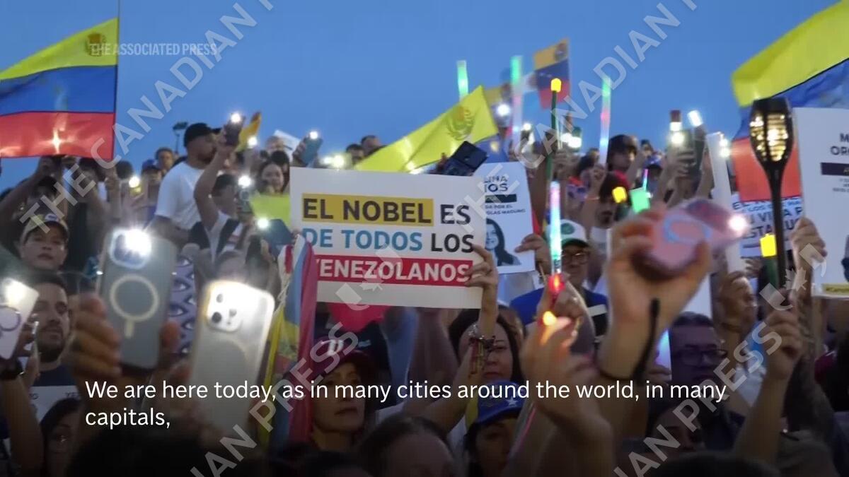 Supporters of Venezuelan opposition leader María Corina Machado rallied in several cities across Latin America on Saturday to commemorate her Nobel Peace Prize win ahead of the prestigious award ceremony next week. (AP video by Cesar Barreto, Cristian Kovadloff and Alexandre Plaza)
