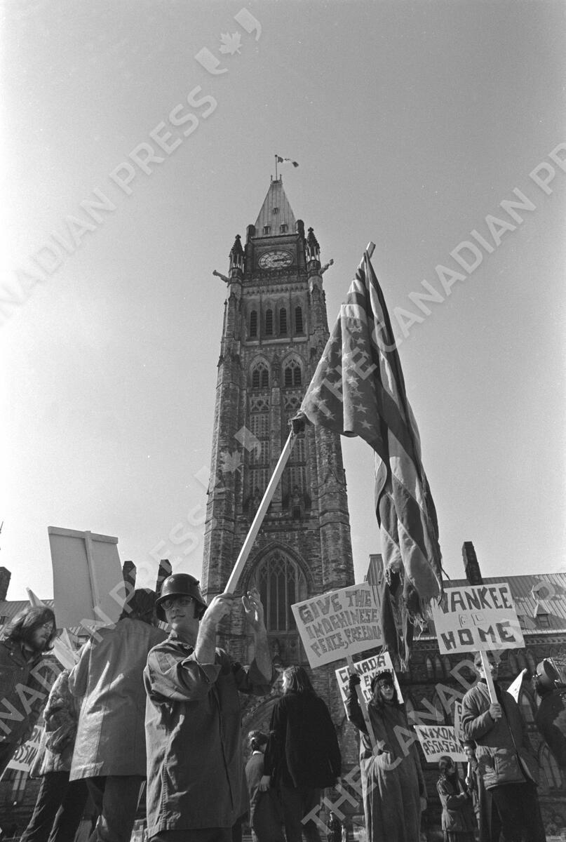 From the archival negative sleeve: People protest U.S. President Richard Nixon’s arrival at Parliament Hill in Ottawa. THE CANADIAN PRESS/Russel Mant
