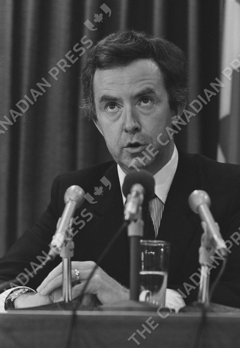 From the archival negative sleeve: Joe Clark press conference on Constitution Day, September 28, 1981. THE CANADIAN PRESS/Carl Bigras
