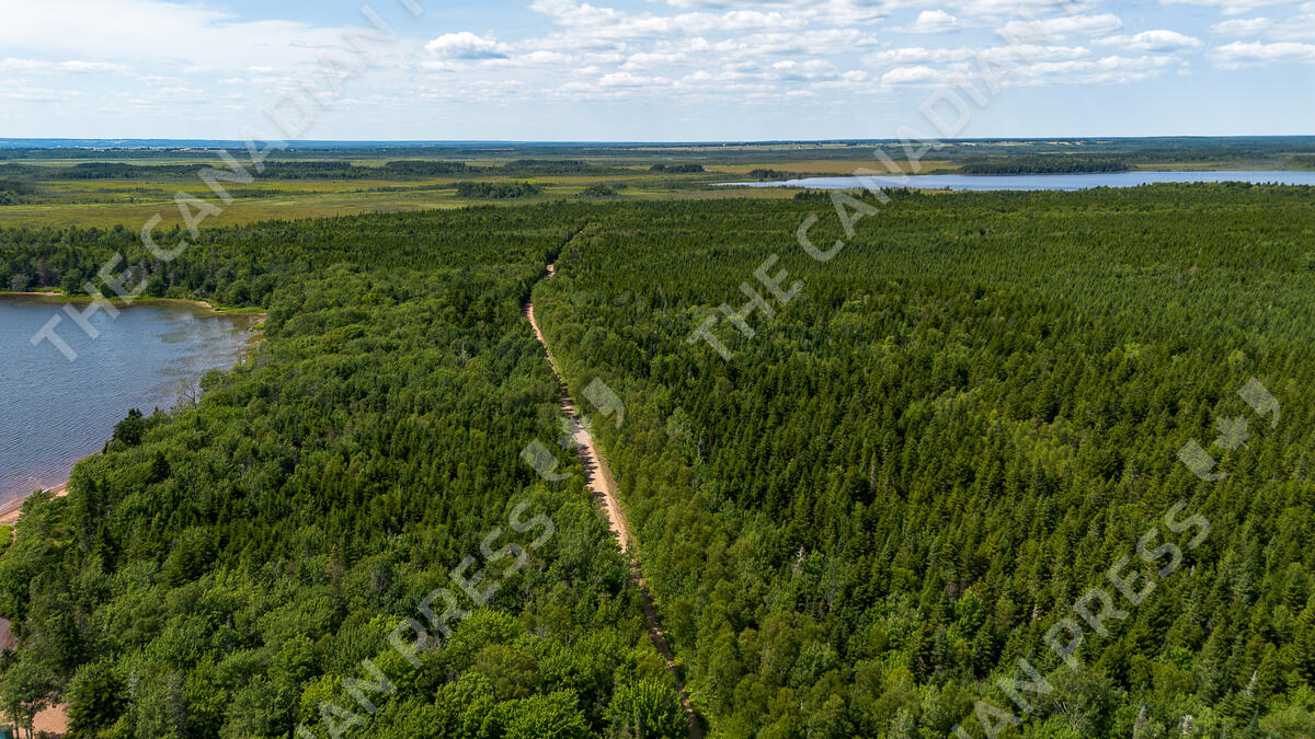 Lrving G6 road stretches northwest between Long Lake, left, and Round Lake, across the centre of the Isthmus of Chignecto, an important tract of land linking New Brunswick and Nova Scotia, seen from an aerial perspective in Cumberland County, N.S., Wednesday, July 23, 2025. THE CANADIAN PRESS/Giordano Ciampini