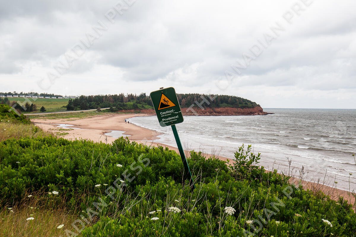 Signage on a cliff above North Rustico Beach warns visitors of the danger of cliff erosion in Prince Edward Island National Park, P.E.I., Monday, Jul 21, 2025. THE CANADIAN PRESS/Giordano Ciampini