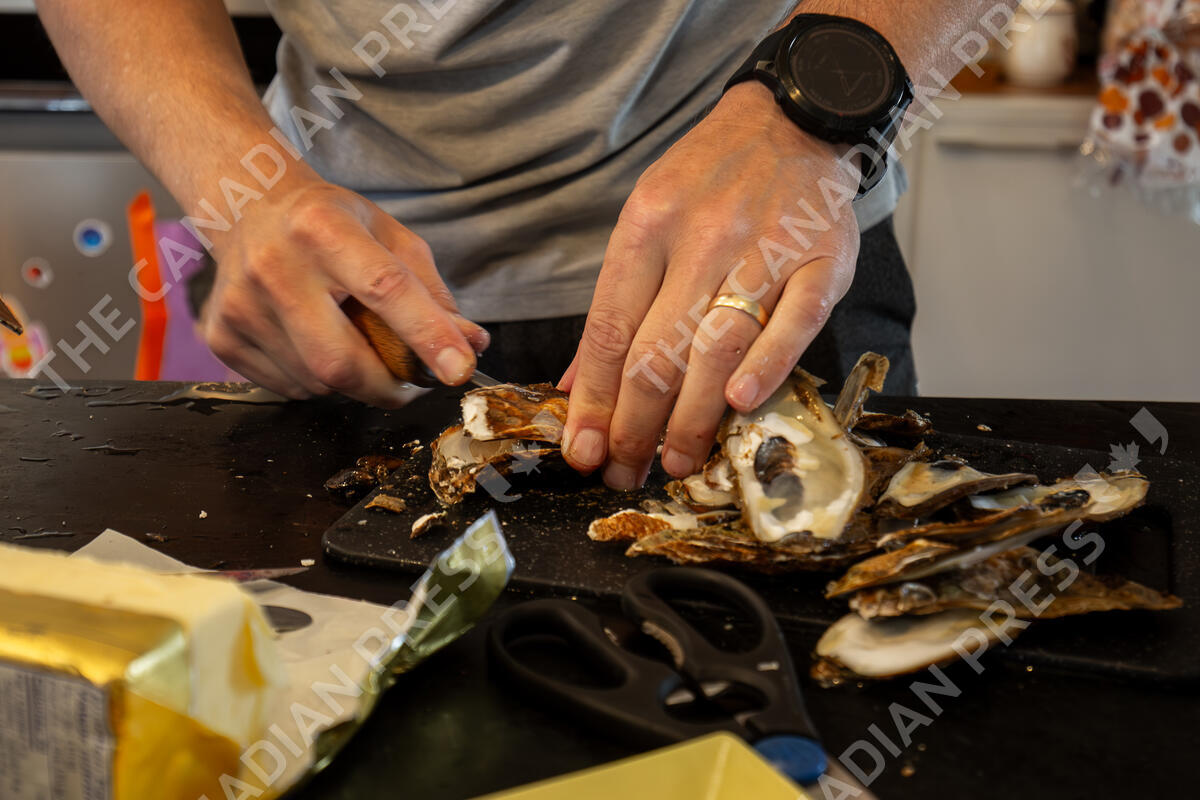 A man shucks Malpeque oysters in Summerside, P.E.I., Sunday, Jul 20, 2025. THE CANADIAN PRESS/Giordano Ciampini
