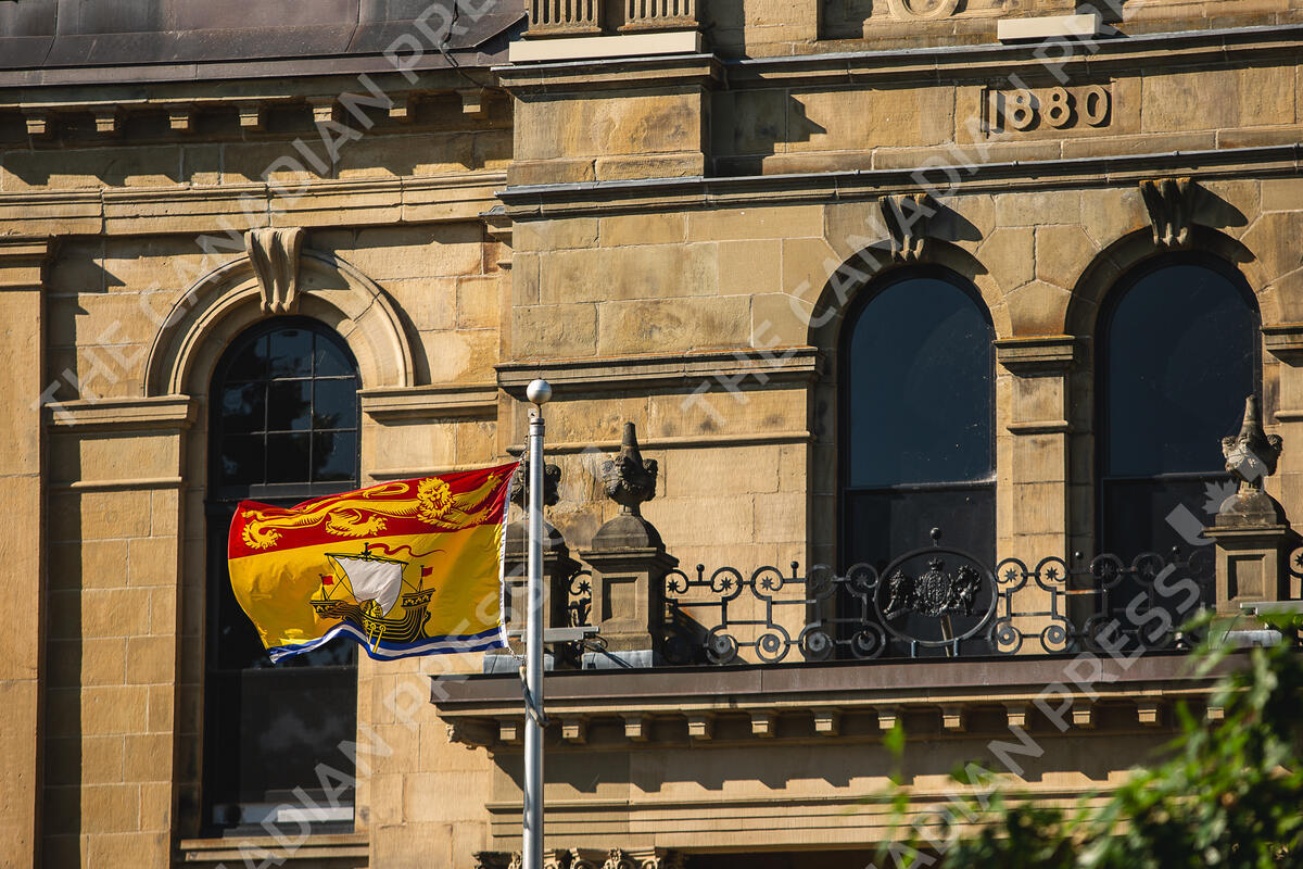 The New Brunswick flag flies in front of the Legislative Assembly Building, home of the provincial parliament, in Fredericton, Saturday, July 26, 2025. THE CANADIAN PRESS/Giordano Ciampini
