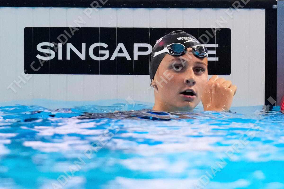 Summer Mcintosh of Canada reacts after winning gold medal in the women's 200-meter butterfly final at the World Aquatics Championships in Singapore, Thursday, July 31, 2025. (AP Photo/Vincent Thian)