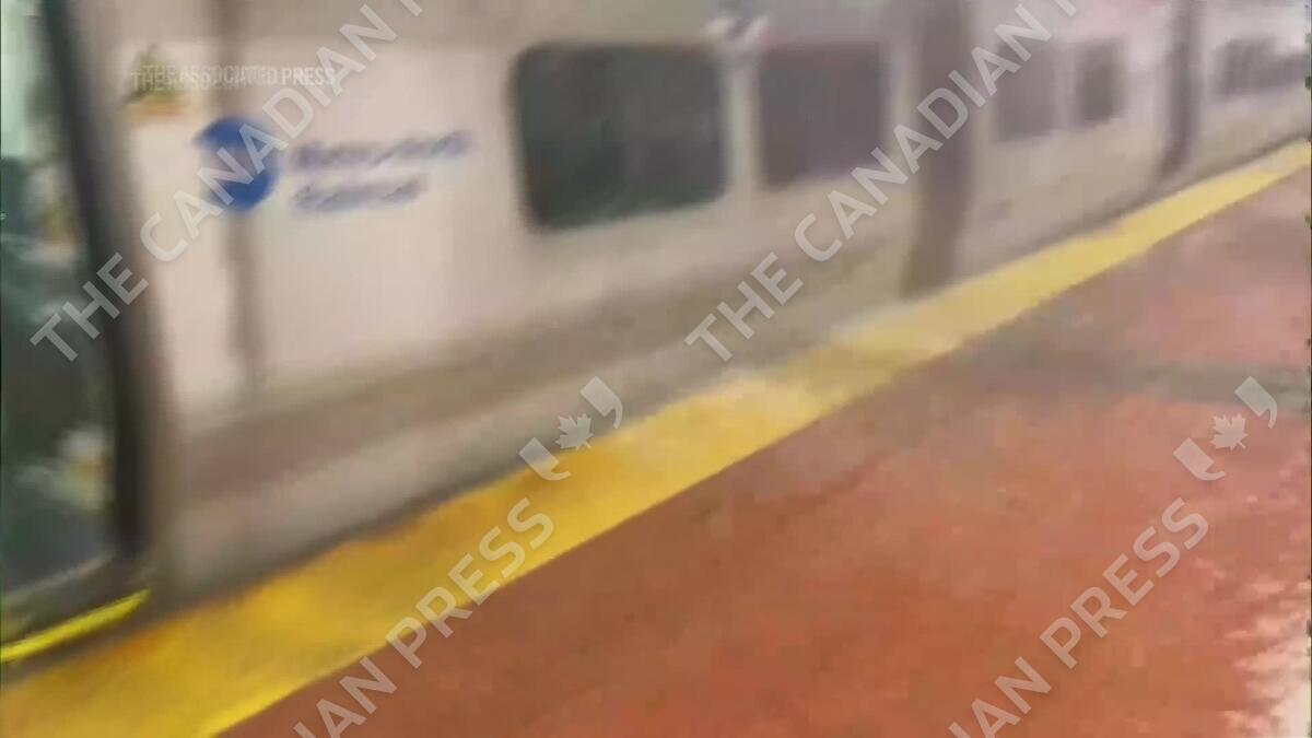 Water pours on Grand Central Station train platforms as strong rain storms hits New York