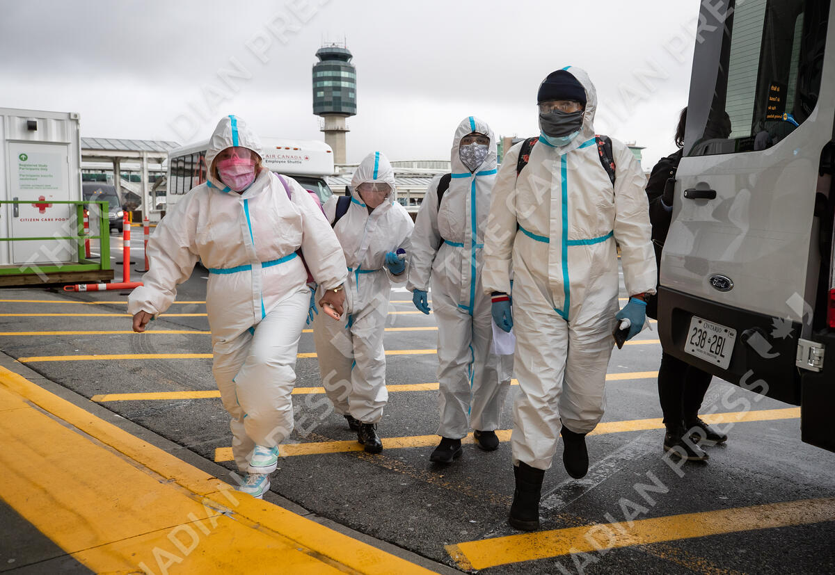 People wearing protective face masks, goggles and Tyvek suits who said they traveled from Colombia prepare to get into a car rental company shuttle, after arriving at Vancouver International Airport in Richmond, B.C., on Thursday, December 31, 2020. Beginning January 7, air travellers arriving in Canada will be required to provide proof of a negative COVID-19 test conducted within 72 hours of boarding the plane. THE CANADIAN PRESS/Darryl Dyck
