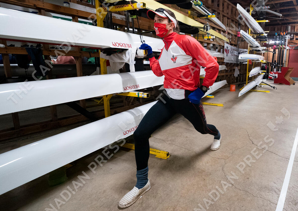 Canadian Olympic rower Carling Zeeman warms up prior to hitting the water at the Elk Lake training facility in Victoria, B.C., Wednesday, Dec. 9, 2020. The rowing facility which is home to national team members has employed Covid-19 protocols such as one-way walking lanes to the dock and boathouse, hand washing stations and a mask policy as athletes prepare for the rescheduled 2021 Tokyo Summer Olympics. THE CANADIAN PRESS/Jonathan Hayward