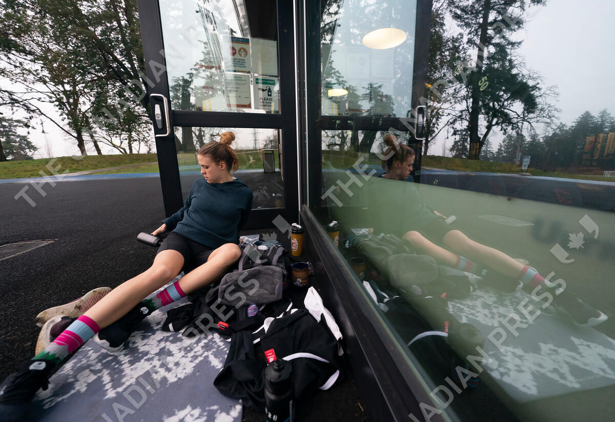 Olympic steeplechase athlete Erin Teschuk takes part in a cool down following a practice session at the Pacific Institute for Sport Excellence in Victoria, B.C., Tuesday, Dec. 8, 2020. COVID-19 protocols have adjusted athletes training schedules as they prepare for the rescheduled 2021 Tokyo Olympics. THE CANADIAN PRESS/Jonathan Hayward