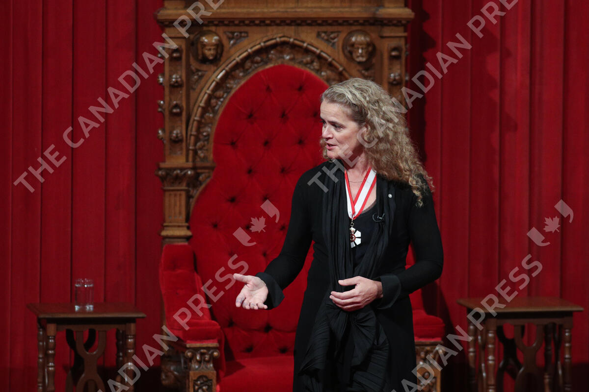 Canada's newly installed Governor General Julie Payette gestures while she speaks after being installed as Canada's 29th Governor General in the Senate on Parliament Hill in Ottawa, Ontario on Monday, October 2, 2017. THE CANADIAN PRESS IMAGES/Lars Hagberg