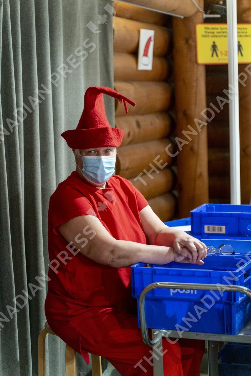 Seniro elf Auli Sihvo wearing face mask at the Santa Claus' Main Post Office at the Santa's Village in the Arctic Circle, Rovaniemi, Finnish Lapland, on December 18, 2020. KAISA SIREN / LEHTIKUVA - FINLAND OUT. NO THIRD PARTY SALES.