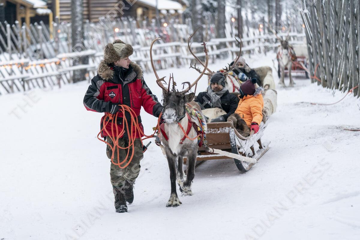 Tourists enjoying a reindeer ride arranged by Santa Claus Reindeer company at the Santa's Village in the Arctic Circle, Rovaniemi, Finnish Lapland, on December 18, 2020. KAISA SIREN / LEHTIKUVA - FINLAND OUT. NO THIRD PARTY SALES.