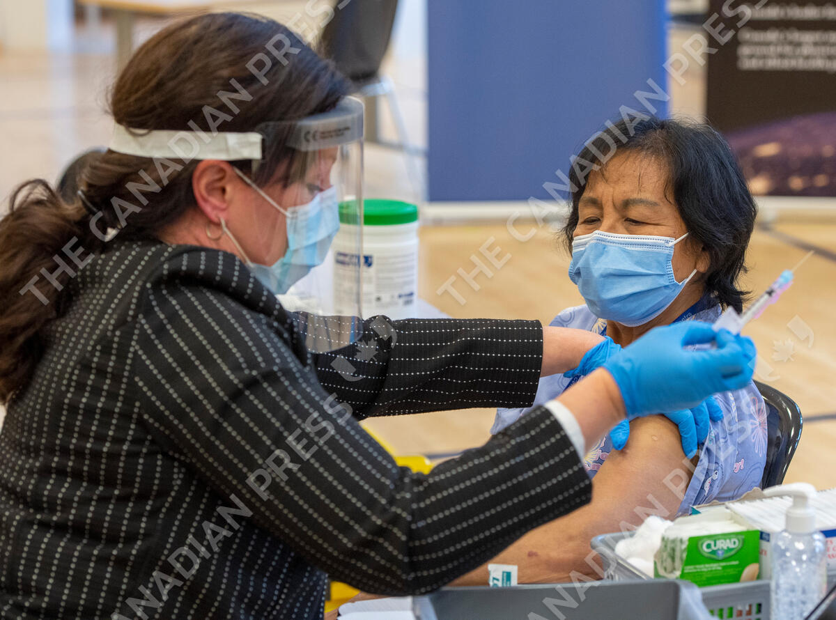 The first Pfizer-BioNTech COVID-19 vaccine in Canada is administered to personal support worker Anita Quidangen by UHN Director of Health Services Tamara Dus at The Michener Institute in Toronto on Monday, Dec. 14, 2020. THE CANADIAN PRESS/Frank Gunn