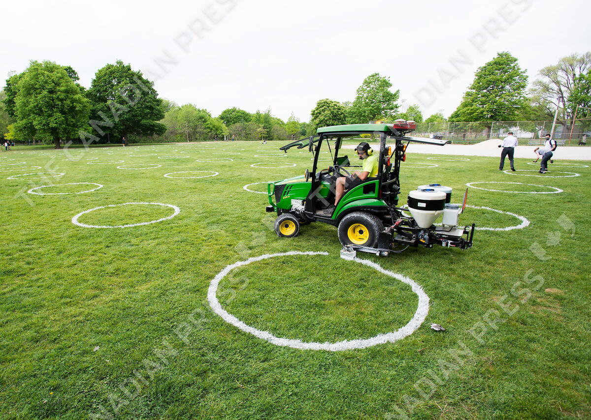 A worker paints environmentally-friendly physical distancing circles at Trinity Bellwoods Park during the COVID-19 pandemic in Toronto on Thursday, May 28, 2020. THE CANADIAN PRESS/Nathan Denette