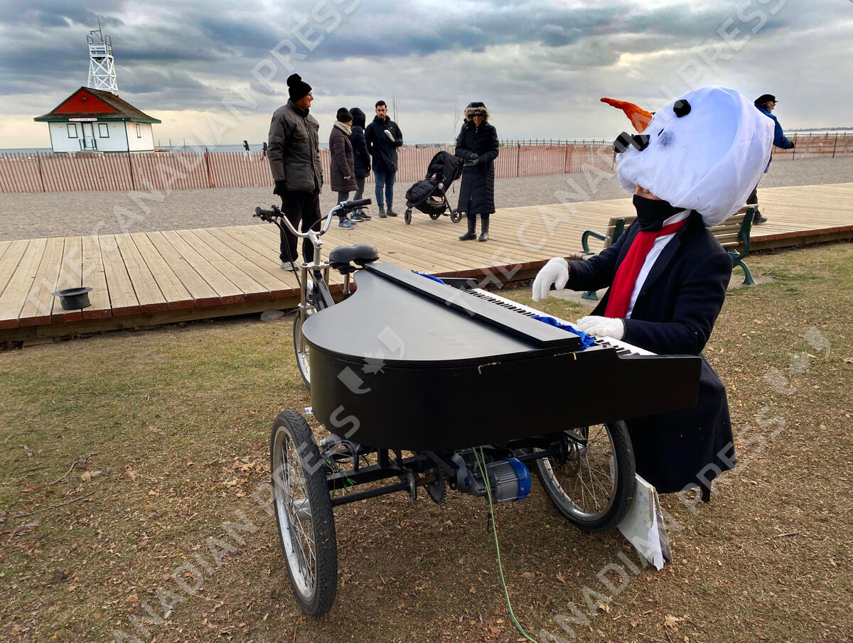 A man wears a snowman headdress as he plays a tricycle drawn piano on the boardwalk in Toronto on Tuesday, Dec. 15, 2020. THE CANADIAN PRESS/Frank Gunn