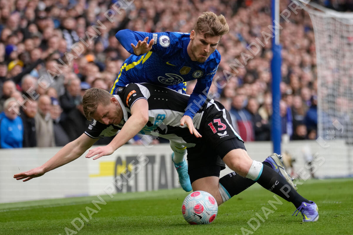 Chelsea's Timo Werner, top, and Newcastle's Matt Targett vie for the ball during the English Premier League soccer match between Chelsea and Newcastle United at Stamford Bridge stadium in London, Sunday, March 13, 2022. (AP Photo/Kirsty Wigglesworth)