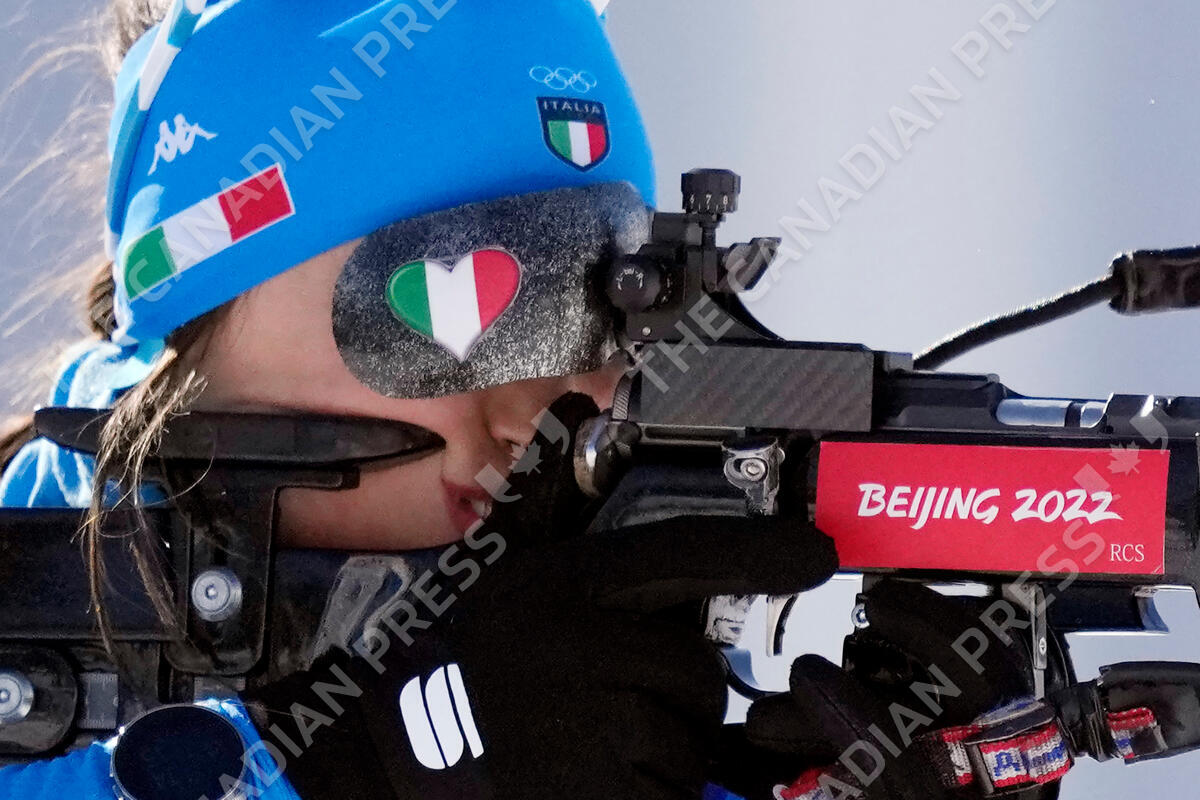 Dorothea Wierer of Italy shoots during zeroing in the women's 12.5-kilometer mass start biathlon at the 2022 Winter Olympics, Friday, Feb. 18, 2022, in Zhangjiakou, China. (AP Photo/Frank Augstein)