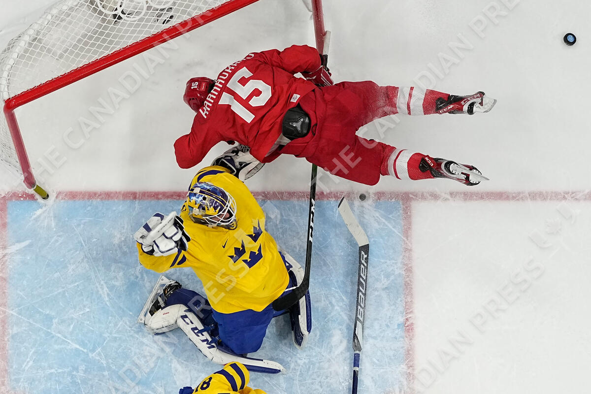 Russian Olympic Committee's Pavel Karnaukhov (15) collides with Sweden goalkeeper Lars Johansson during overtime in a men's semifinal hockey game at the 2022 Winter Olympics, Friday, Feb. 18, 2022, in Beijing. (AP Photo/Matt Slocum)