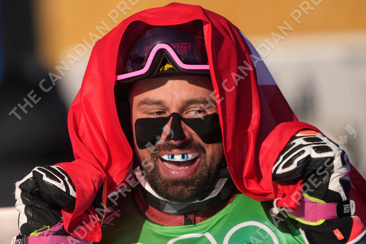 Switzerland's Ryan Regez celebrates after winning a gold medal in the men's cross at the 2022 Winter Olympics, Friday, Feb. 18, 2022, in Zhangjiakou, China. (AP Photo/Francisco Seco)