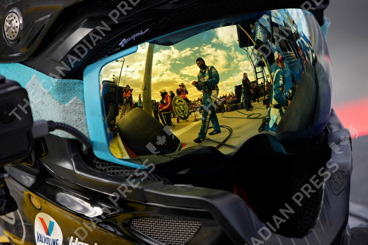 Pit crew members for driver Kyle Larson are reflected in a helmet during a NASCAR Cup Series auto race Sunday, March 6, 2022, in Las Vegas. (AP Photo/John Locher)