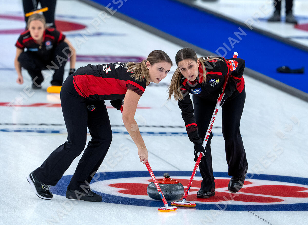Ontario lead Tess Bobbie, left, and second Rachelle Strybosch sweep a rock from third Megan Balsdon as they play Manitoba at the Scotties Tournament of Hearts at Fort William Gardens in Thunder Bay, Ont. on Monday, Jan. 31, 2022. THE CANADIAN PRESS/Andrew Vaughan