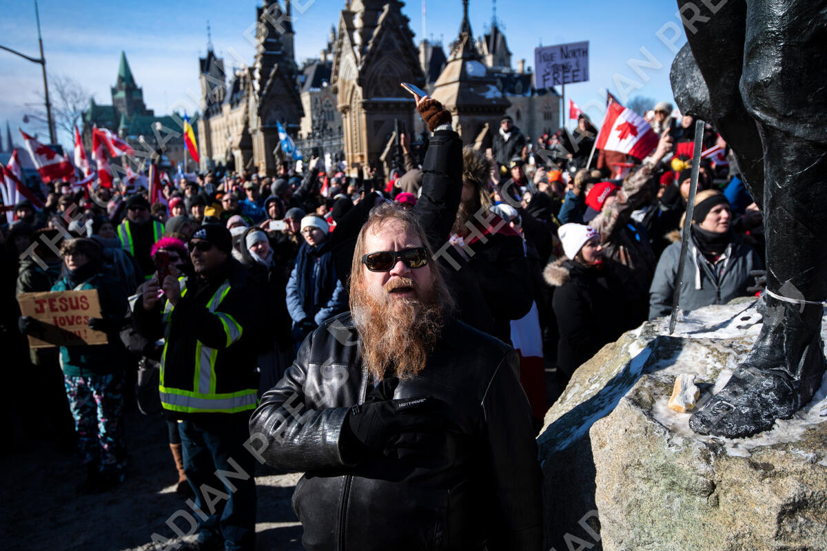 A person holds their hand to their heart during a singing of O Canada during a rally against COVID-19 restrictions on Parliament Hill, which began as a cross-country convoy protesting a federal vaccine mandate for truckers, in Ottawa on Sunday, Jan. 30, 2022. THE CANADIAN PRESS/Justin Tang