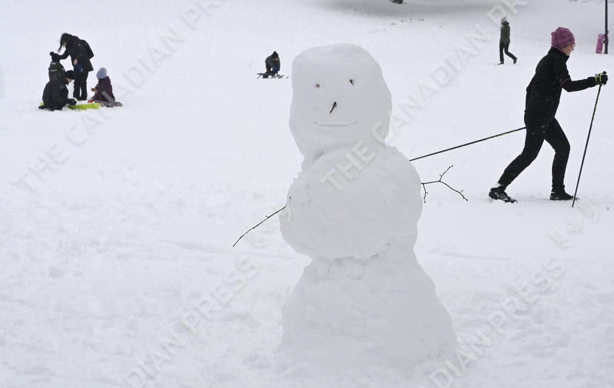 Skier passes a snowman in the Kaivopuisto Park after the snow storm Valtteri in Helsinki, Finland on Sunday, 30th Jan., 2022. LEHTIKUVA / HEIKKI SAUKKOMAA - FINLAND OUT. NO THIRD PARTY SALES.