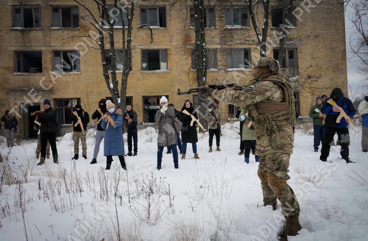 Local residents train close to Kyiv, Ukraine, Sunday, Jan. 30, 2022. Russia's foreign minister claims that NATO wants to pull Ukraine into the alliance, amid escalating tensions over NATO expansion and fears that Russia is preparing to invade Ukraine. In comments on state television Sunday, Foreign Minister Sergey Lavrov also challenged NATO's claim to be a purely defensive structure. (AP Photo/Efrem Lukatsky)