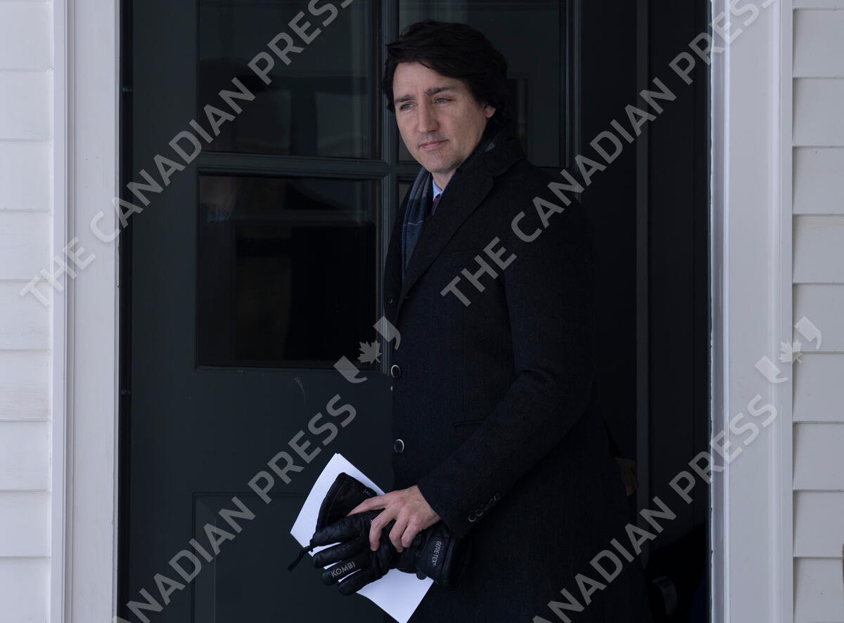 Canadian Prime Minister Justin Trudeau steps out of a building to speak with the media during his first availability after announcing he has COVID-19 at a location in the National Capital Region, Monday, January 31, 2022. THE CANADIAN PRESS/Adrian Wyld