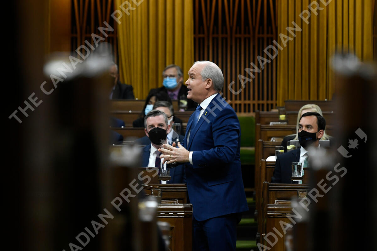 Conservative Leader Erin O'Toole rises during Question Period in the House of Commons on Parliament Hill in Ottawa on Monday, Jan. 31, 2022. THE CANADIAN PRESS/Justin Tang