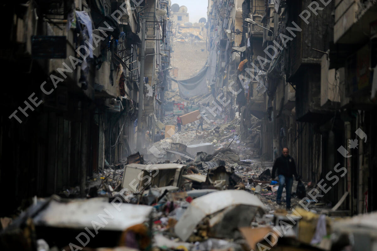 FILE - Residents walk through the destruction of the once rebel-held Salaheddine neighborhood in the eastern Aleppo, Syria, Friday, Jan. 20, 2017. Tuesday, March 15, 2022 marks the 11th anniversary of Syria's revolution-turned-civil war. This year, many survivors are watching in shock as Ukrainians face the same horrors they did. (AP Photo/Hassan Ammar, File)