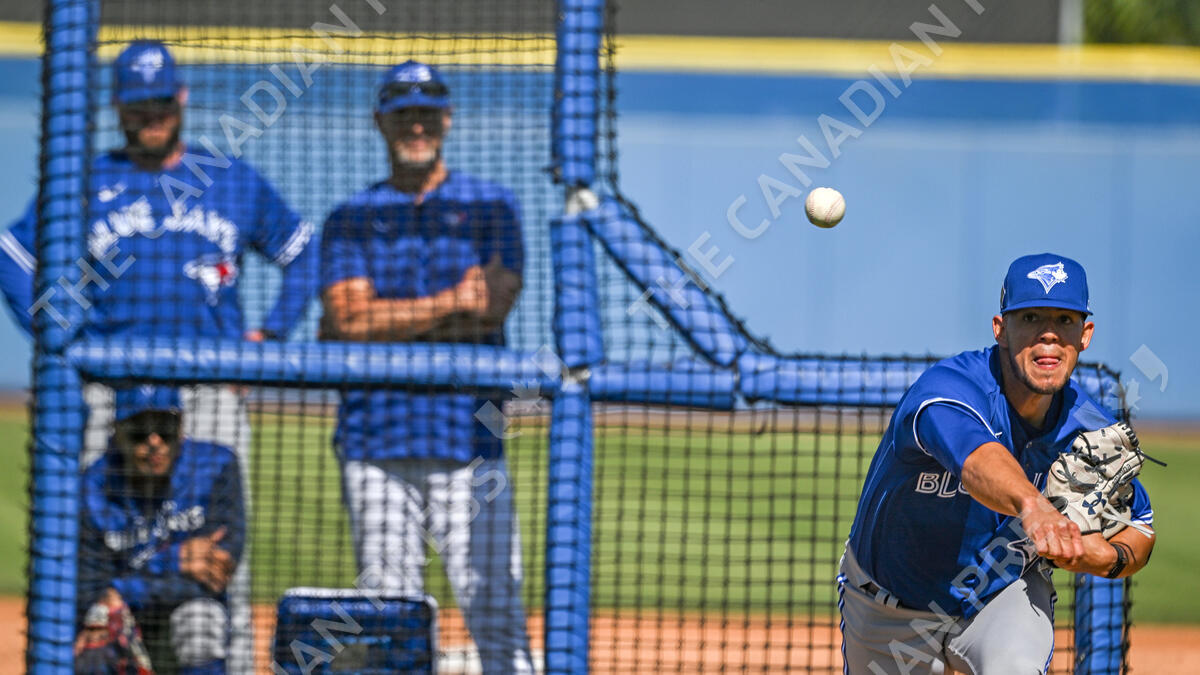 Toronto Blue Jays coaches look on as pitcher Jose Berrios throws batting practice during a spring training workout Monday, March 14, 2022, in Dunedin, Fla. THE CANADIAN PRESS/Steve