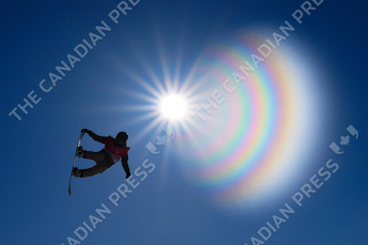 A rider warms up prior to competing in the women's snowboard slopestyle qualifications at the Genting Snow Park during the Beijing Winter Olympics in Zhangjiakou, China, on Saturday Feb. 5, 2022. THE CANADIAN PRESS/Sean Kilpatrick