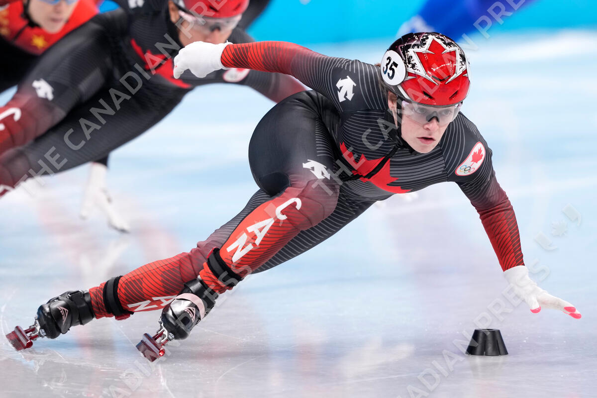 Canada's Kim Boutin rounds a corner during the women's 500-metre short-track speedskating quarter-final round at the Beijing Winter Olympics in Beijing, China, on Monday, Feb. 7, 2022. THE CANADIAN PRESS/Paul Chiasson