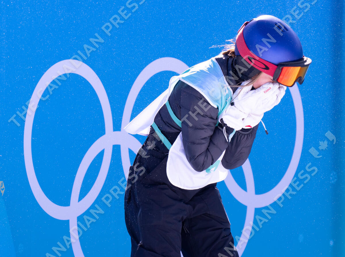 Ailing Eileen Gu from China reacts at the end of her third run to go on to win the gold medal in the women's Freestyle Skiing Big Air at the 2022 Winter Olympics in Beijing, Tuesday, Feb. 8, 2022. THE CANADIAN PRESS/Paul Chiasson