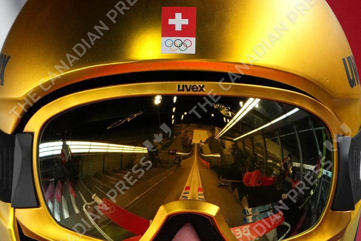 Dominik Peter, of Switzerland, prepares for his jump during the men's normal hill individual ski jumping trial round at the 2022 Winter Olympics, Sunday, Feb. 6, 2022, in Zhangjiakou, China. (AP Photo/Matthias Schrader, Pool)