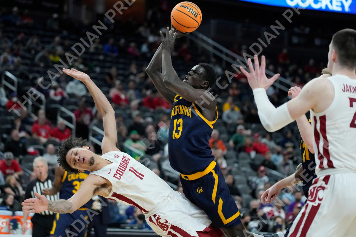California's Kuany Kuany (13) fouls Washington State's DJ Rodman (11) during the second half of an NCAA college basketball game in the first round of the Pac-12 tournament Wednesday, March 9, 2022, in Las Vegas. (AP Photo/John Locher)