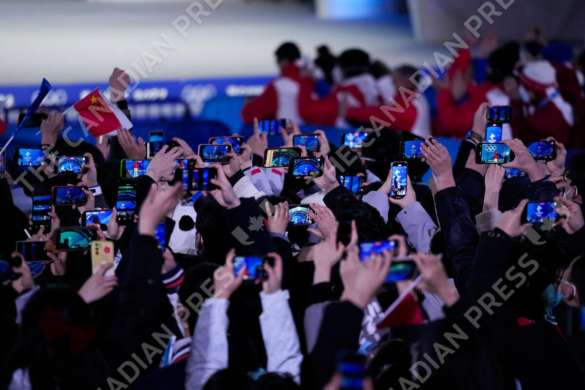 Olympic workers and volunteers hold up their smartphones to record a medal ceremony for the women's freestyle skiing big air at the 2022 Winter Olympics, Tuesday, Feb. 8, 2022, in Beijing. (AP Photo/Jae C. Hong)