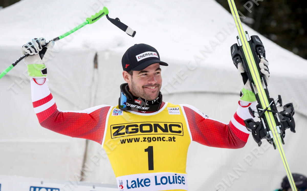 Austria's Vincent Kriechmayr celebrates his second place finish following the men's World Cup downhill ski race at Lake Louise, Alta., Saturday, Nov. 27, 2021.THE CANADIAN PRESS/Jeff McIntosh