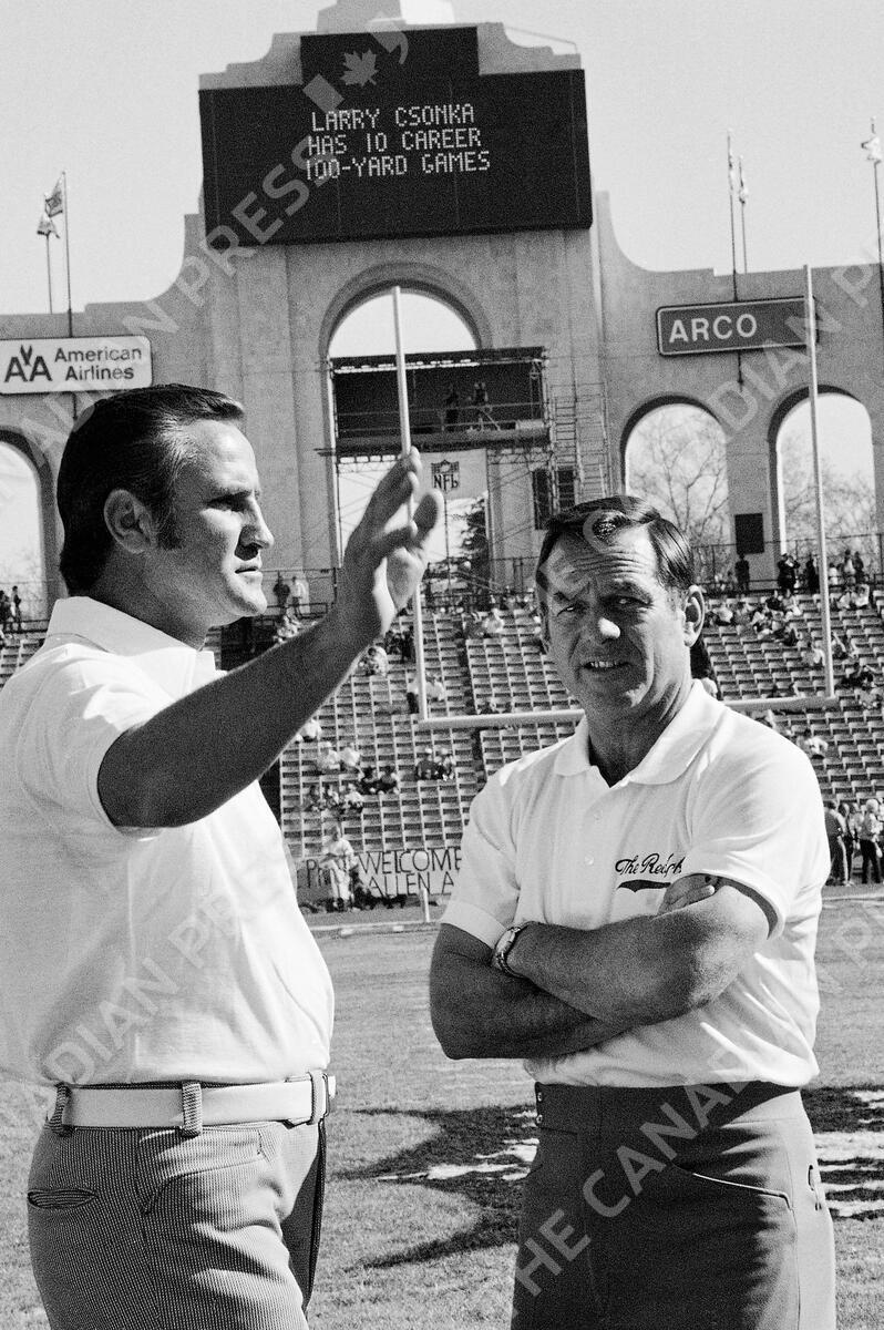 FILE - Miami Dolphins' head coach Don Shula, left, and Washington Redskins' defense coach Charley Winner inspect the turf at the Los Angeles Coliseum before the start of Super Bowl game on Jan. 14, 1973 in Los Angeles. The 1973 game was the last Super Bowl held at the Coliseum, which originally was built for the 1932 Summer Olympics and remodeled several times. (AP Photo/File)
