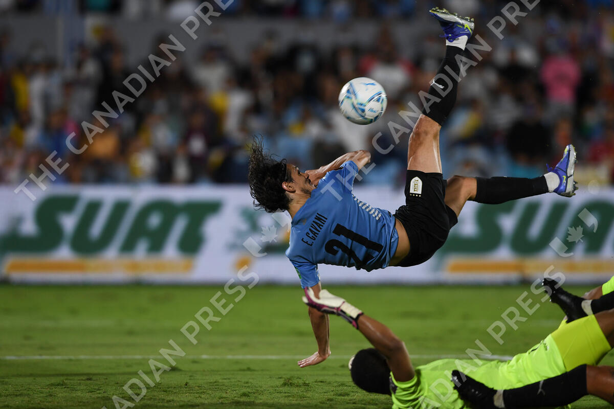 Uruguay's Edinson Cavani does a bicycle kick to score his side's third goal against Venezuela during a qualifying soccer match for the FIFA World Cup Qatar 2022 at Centenario stadium in Montevideo, Uruguay, Tuesday, Feb. 1, 2022. (Pablo Porciuncula, Pool via AP)