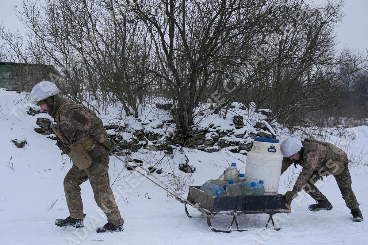 Ukrainian servicemen carry water supplies for an advanced position on the front line in the Luhansk area, eastern Ukraine, Thursday, Jan. 27, 2022. The U.S. rejection of Russia's main demands to resolve the crisis over Ukraine left "little ground for optimism," the Kremlin said Thursday, but added that dialogue was still possible. (AP Photo/Vadim Ghirda)