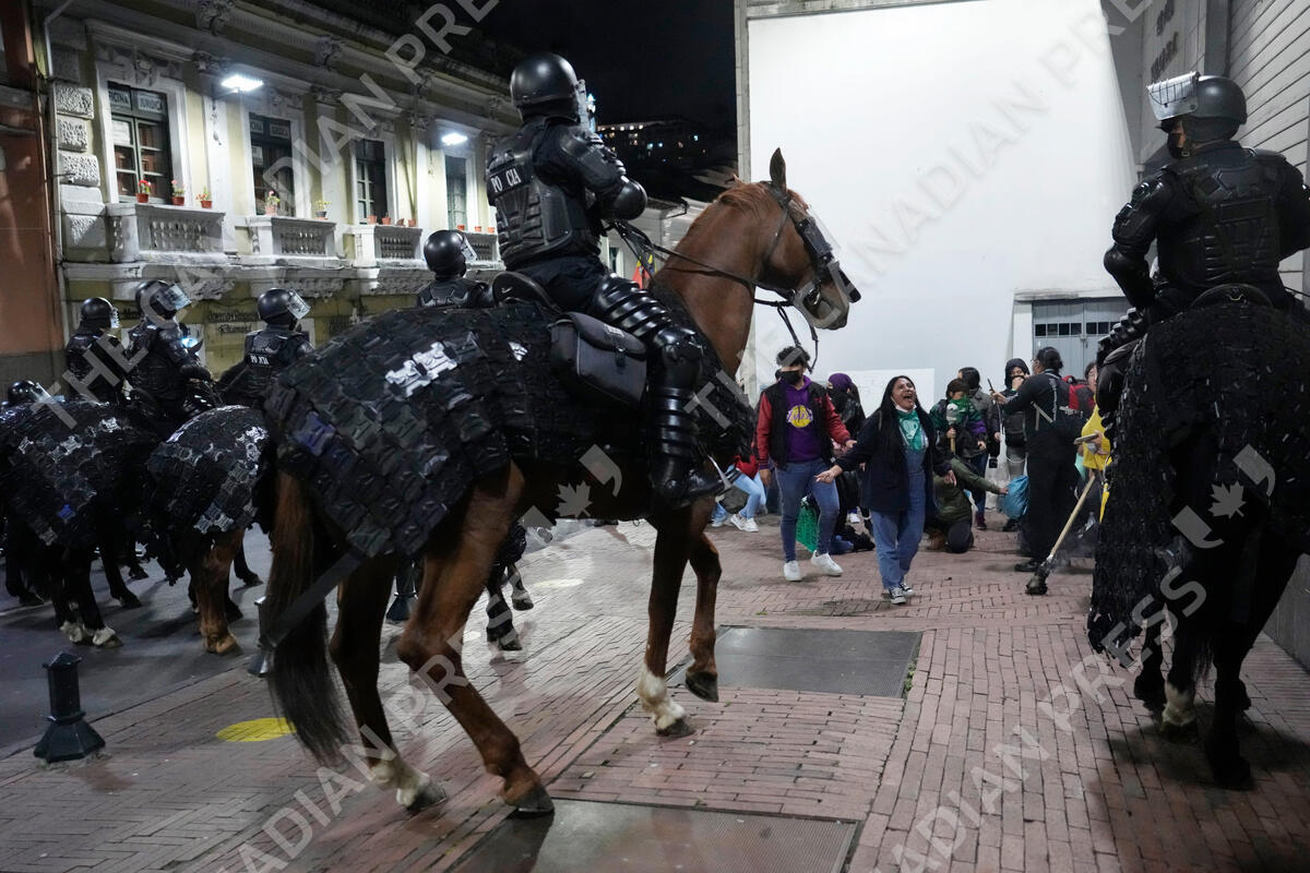Women clash with police during a march to mark International Women's Day in Quito, Ecuador, Tuesday, March 8, 2022. (AP Photo/Dolores Ochoa)