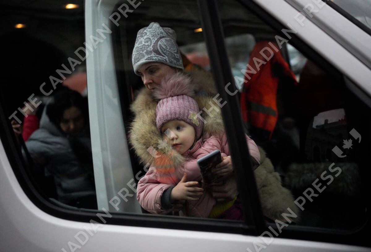 A woman and child, who have fled Ukraine, get out of a van after arriving at the train station in Przemysl, Poland, Tuesday, March 8, 2022. (AP Photo/Daniel Cole)
