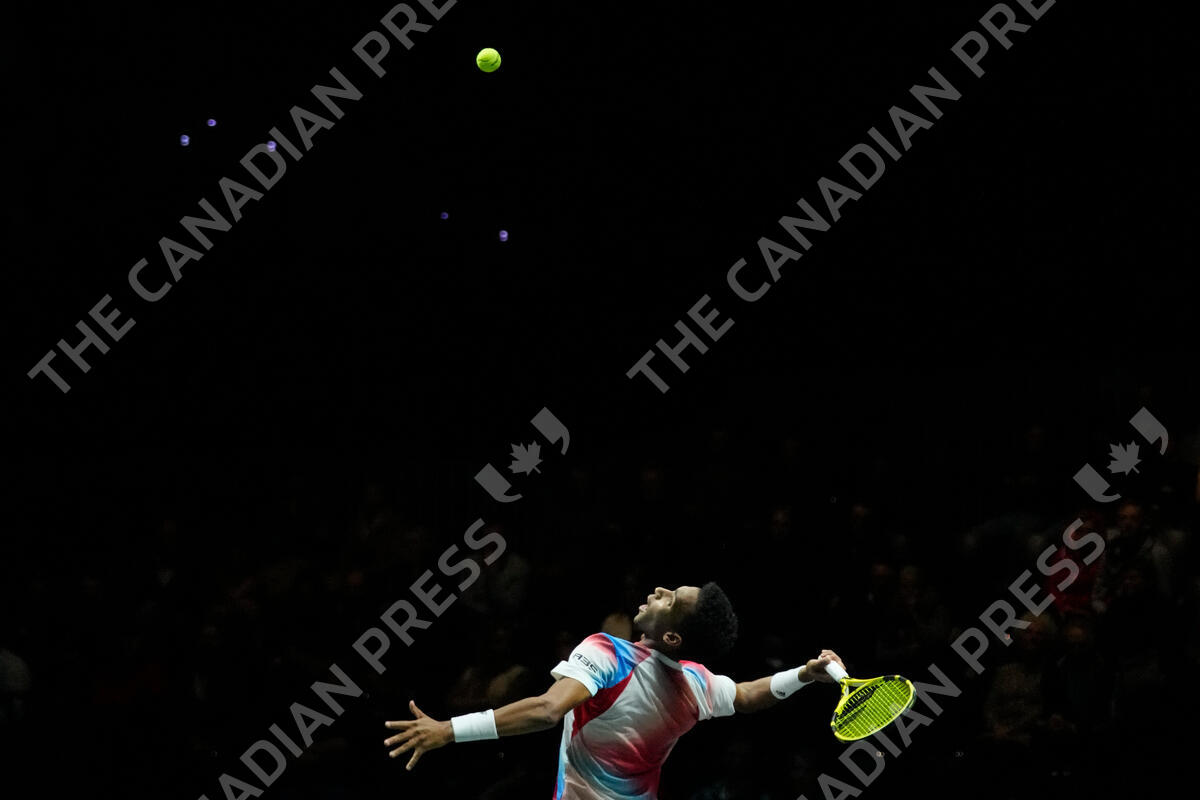 Felix Auger-Aliassime of Canada serves against Cameron Norrie of Britain in their quarterfinal men's singles match of the ABN AMRO world tennis tournament at Ahoy Arena in Rotterdam, Netherlands, Friday, Feb. 11, 2022. (AP Photo/Peter Dejong)