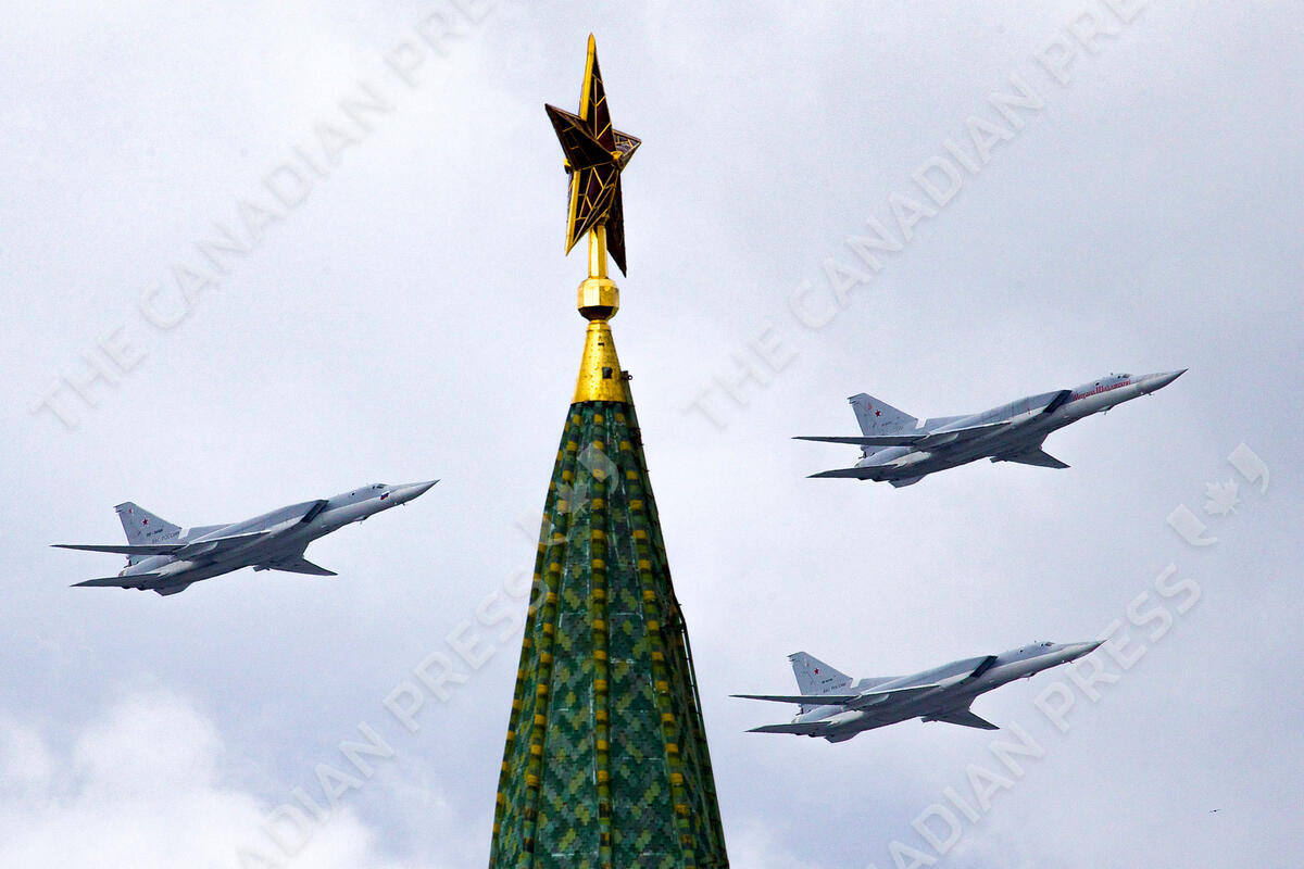 FILE - In this May 5, 2016 file photo, Russian Tu-22M3 bombers fly over the Kremlin's Tower with a Red Star on the top. Russia is planning massive drills of its strategic military forces that provide a stark reminder of the country's nuclear might. The Russian Defense Ministry announced the war games on Friday amid Western fears that Moscow might be preparing to invade Ukraine. (AP Photo/Ivan Sekretarev, File)