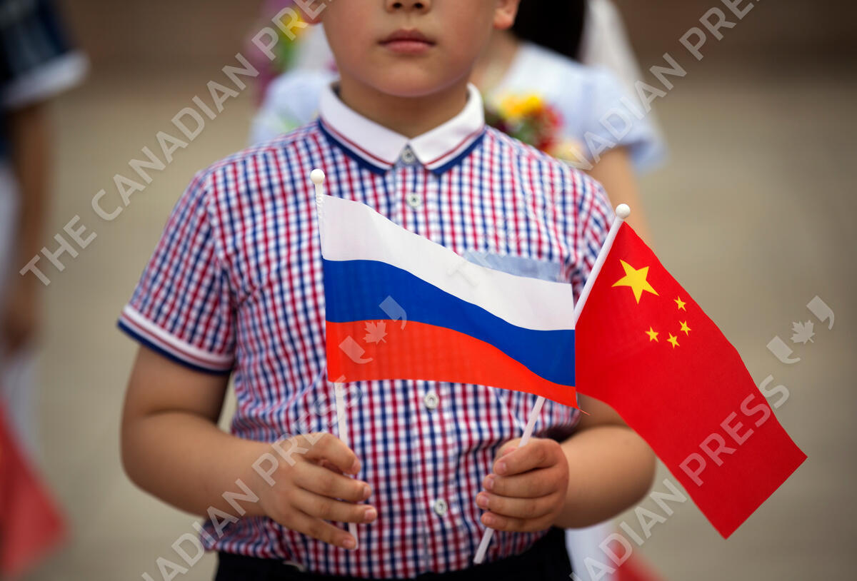 FILE - A boy holds Russian and Chinese flags before a welcoming ceremony for Russian President Vladimir Putin at the Great Hall of the People in Beijing on June 25, 2016. Three weeks ago, on the eve of the Beijing Winter Olympics, the leaders of China and Russia declared that the friendship between their countries "has no limits." But that was before Russia's invasion of Ukraine, a gambit that will test just how far China is willing to go. (AP Photo/Mark Schiefelbein, File)