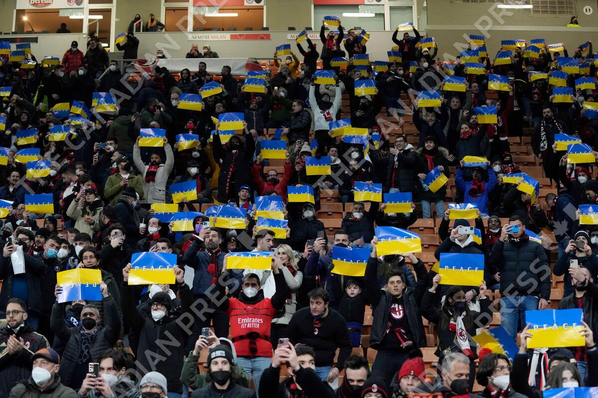 Spectators hold banners that reads 'Peace' ahead of an Italian Cup semifinal, first leg, soccer match between AC Milan and Inter Milan at the San Siro stadium, in Milan, Italy, March 1, 2022. (AP Photo/Antonio Calanni)